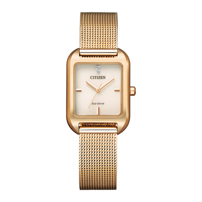 The straight sides of the case evoke the idea of taking a brave, straight path through life. Its feminine and classic appeal boasts elegance and style. Features include Eco-Drive technology – powered by light ,set with two diamonds on the 12 o’clock position and a mesh strap bracelet.