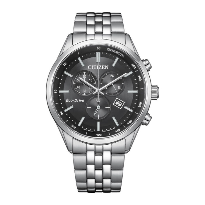 The new CITIZEN Eco-Drive Chronograph exudes modern sophistication with its sleek, masculine design. Crafted from robust stainless steel, this timepiece features a striking black dial complemented by silver-tone accents, creating a bold yet refined look.