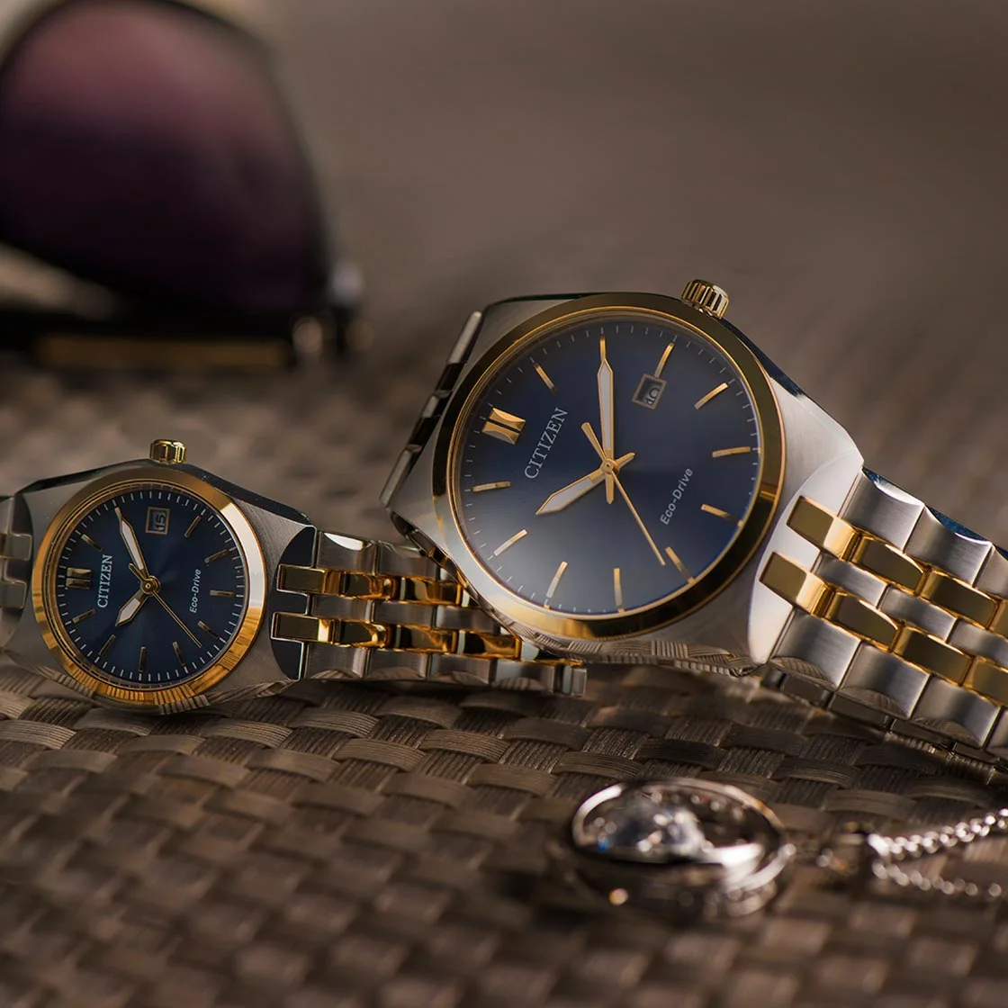 The byword is versatility for this handsome 3-hand Citizen Corso watch crafted in two-tone stainless steel. Details include a sophisticated deep blue dial and a date window perfect for the everyday businessman. Powered by Eco-Drive- the revolutionary light-powered movement from Citizen, this watch can continuously recharge in any light source and can run for a minimum of six months even in the dark without any charge. This revolutionary earth-friendly technology eliminates the need to change the battery frequently and gives you hassle-free timekeeping, never disappointing you when you need it the most. The Eco-Drive movement also comes with a built-in Insufficient Charge Warning Function and Overcharge Prevention Function.