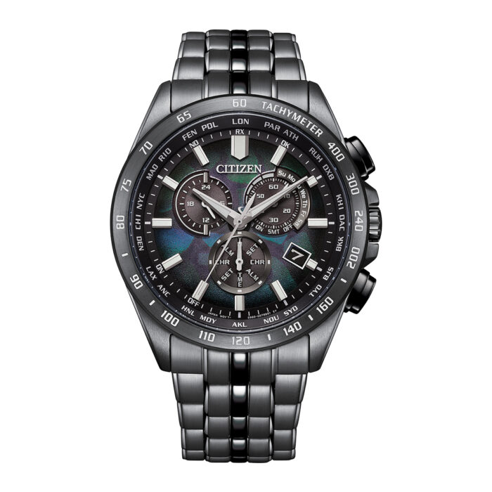 Inspired by the patiently formed layers of Earth’s crust, the new timepiece represents the unique embodiment of Citizen’s watchmaking – using over a century of experience to pair meticulous design with incredible functionality. Joining Citizen’s cutting-edge catalog of timekeepers, the sharp chronograph features a gray IP stainless steel case, measuring 43mm in diameter. Secured to the wrist via a matching 5-link bracelet, this striking timepiece also features an outer tachymeter and inner world time-equipped bezels that hint at the elevated technological capabilities of the watch, while a duo of stepped chronograph pushers and crown guards provide a sleek and sporty touch. On the Earth-inspired dial, a three-register chronograph is at work, with touches of greens, purples, and blues adding crystalline-like dimensionality alongside the utility of a day and date display