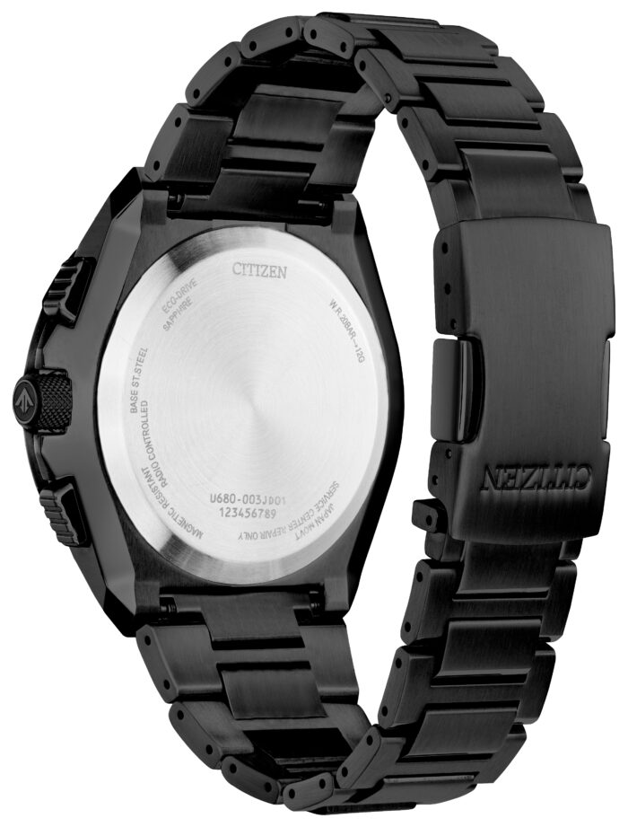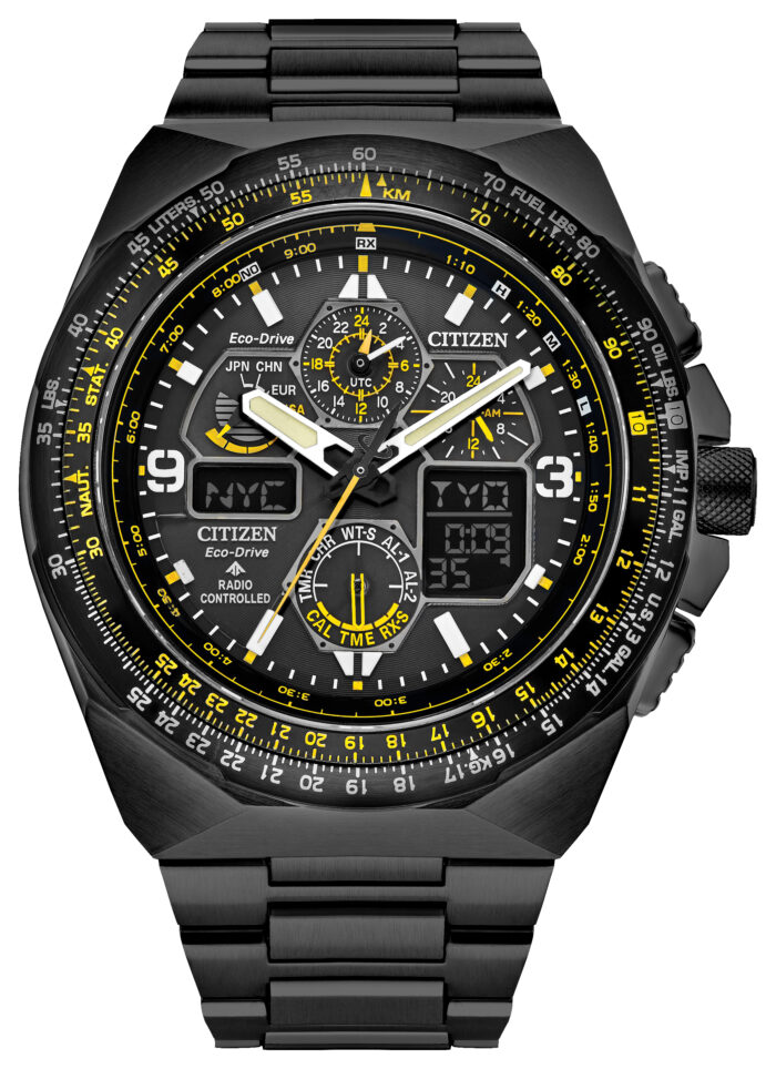 The latest addition to the Promaster Air collection, the Promaster Skyhawk, will take you to new heights in style and performance. The case of this must-have men’s watch is grey ion-plated stainless steel, and the dial is black with yellow accents encased in a sapphire crystal. Atomic time clock synchronization for superior accuracy, time adjustment available in 43 world cities, 1/100 second chronograph measures up to 24 hours, perpetual calendar, GMT dual time (second time zone), 2 alarms, 99-minute countdown timer, digital backlight display, Universal Coordinated Time (UTC) display, and a power reserve indicator are among the advanced features