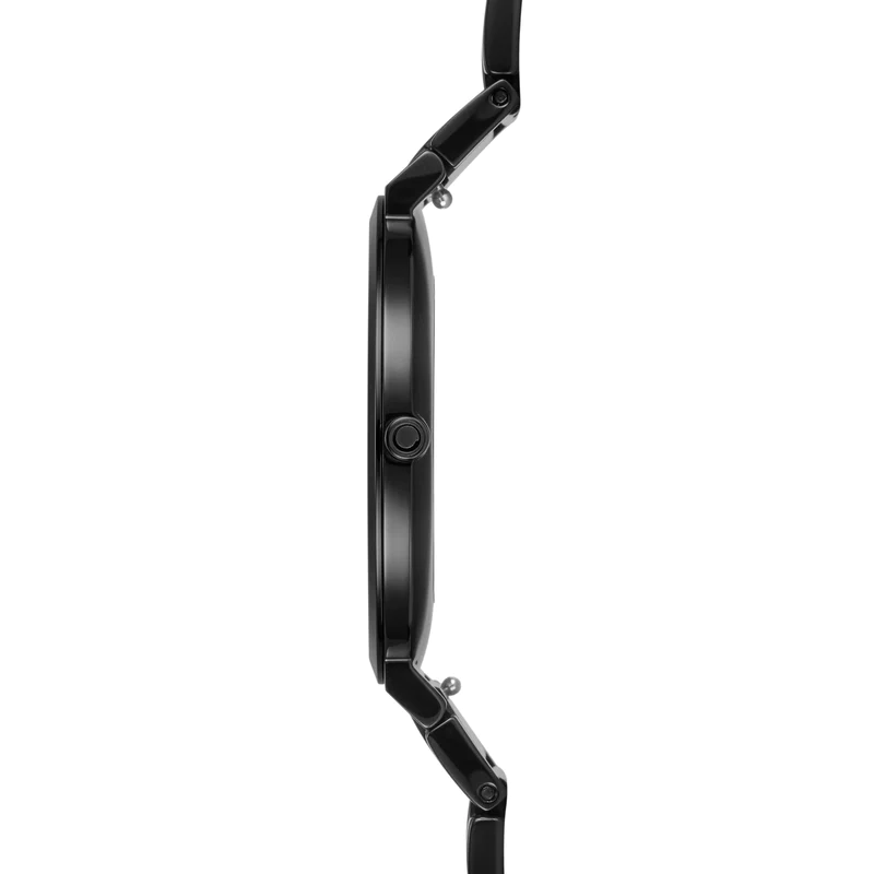 Dark as the night, this stunning watch is meant to subtly impress. The ultra slim case is only 4,8 millimeters slim and the watch is fitted with a scratch-resistant sapphire crystal. Made in surgical stainless steel, this watch is highly corrosion resistant. The black plating on top of the steel is state-of-the art. First a layer of titanium is added to the steel, whereafter the watch undergoes an ionic-plating treatment, ensuring durability. Desgined by Danish designer, Christian Mikkelsen, this watch is 34 millimeters wide and fits elegantly on your wrist. The link comes with an easy-click system, so you can easily click off the link and put on a mesh or leather bracelet of your choice, should you wish to change up the look.